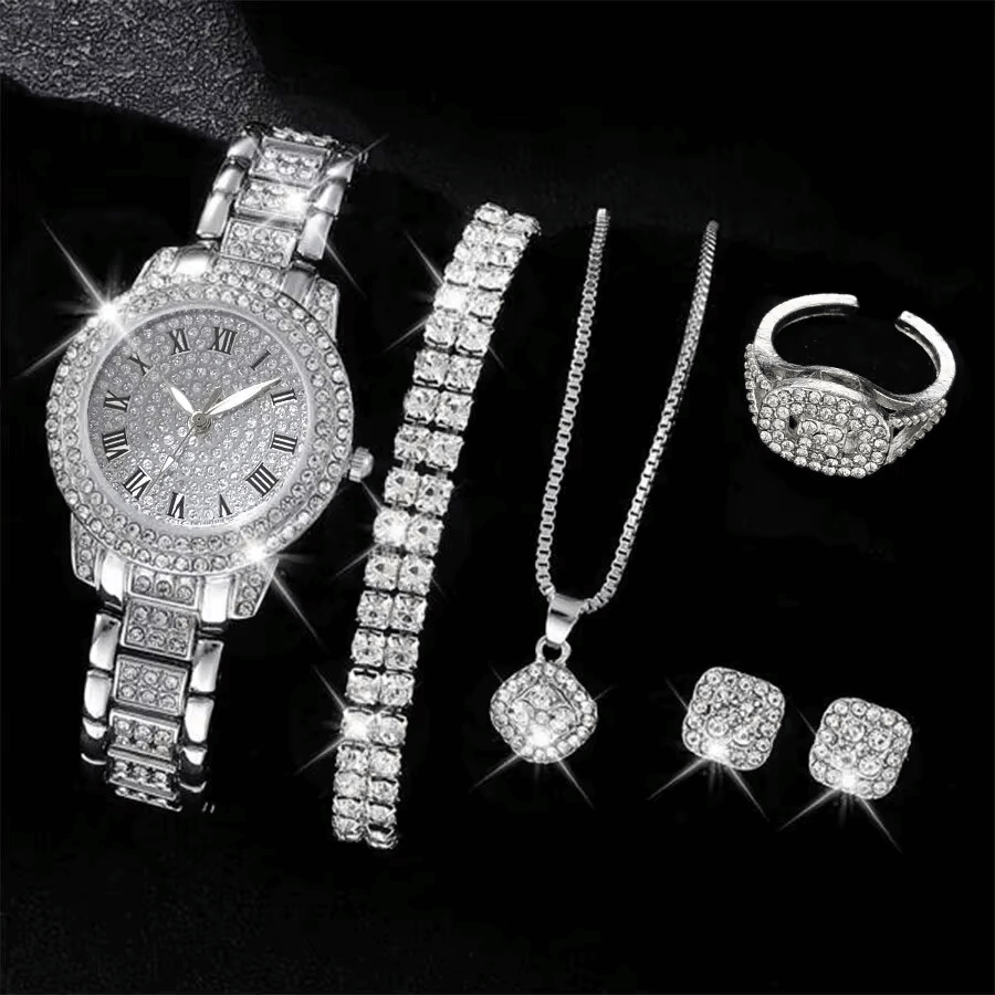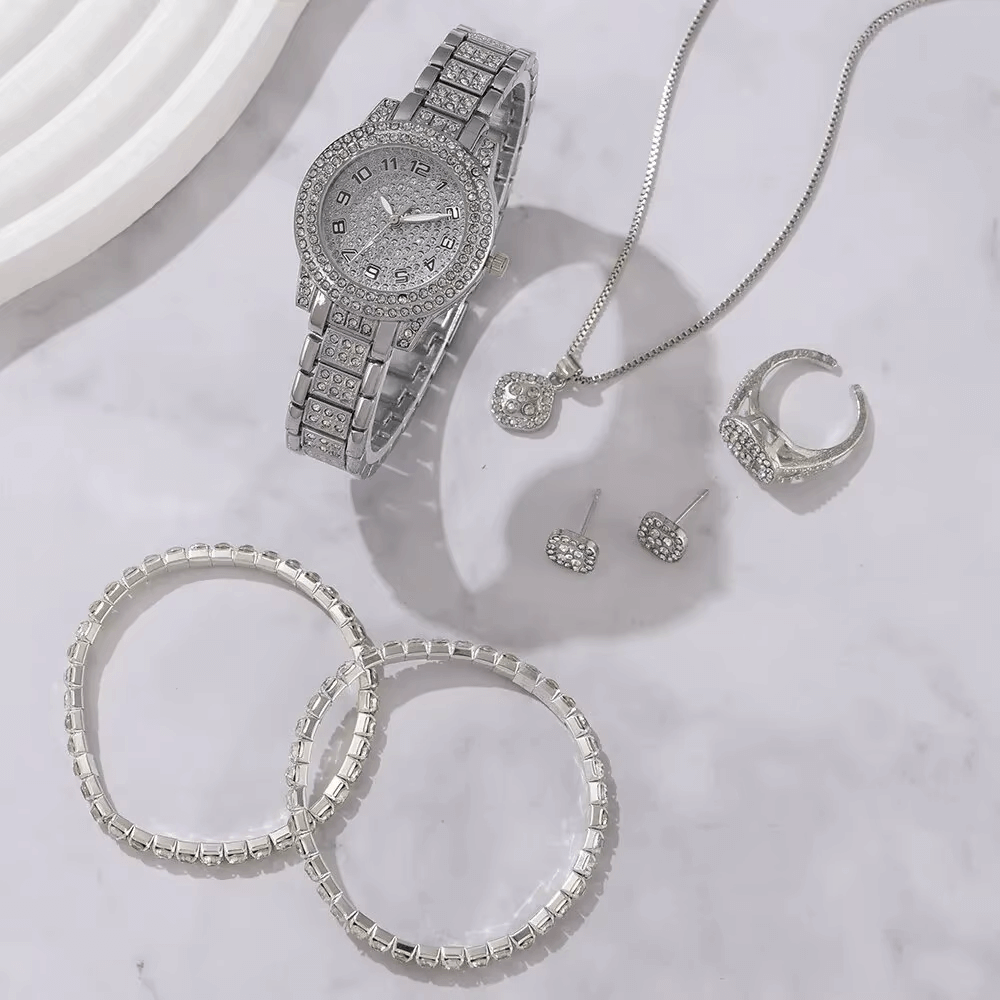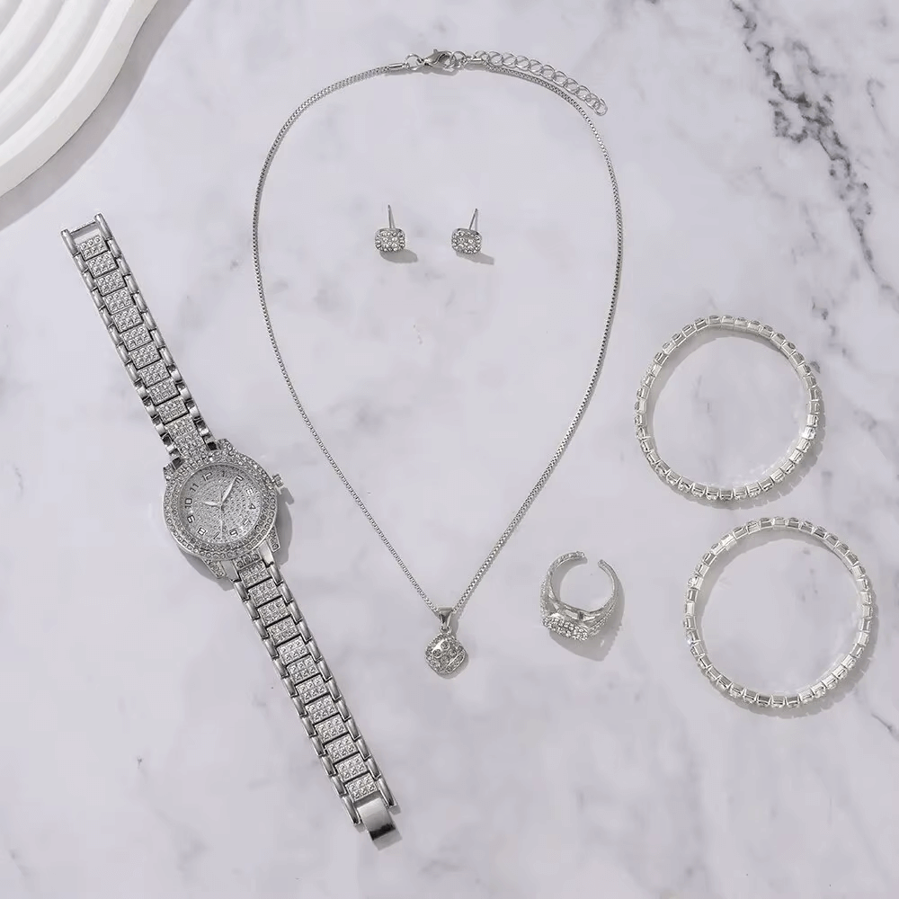 Upgrade your accessory collection with this women’s quartz watch set, designed with elegance and practicality in mind. This 6-piece set includes a beautifully crafted watch and stylish rhinestone bracelet, offering the perfect combination of fashion and functionality for modern women who value timeless style.