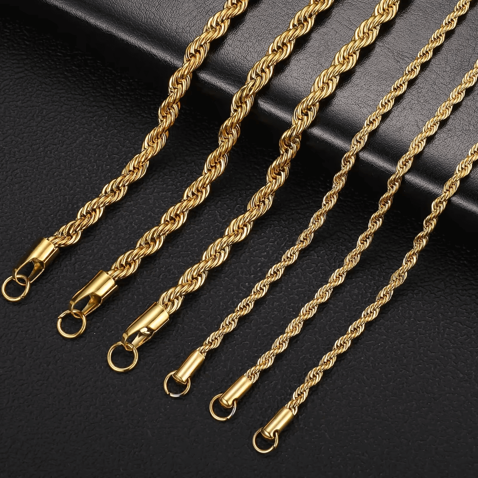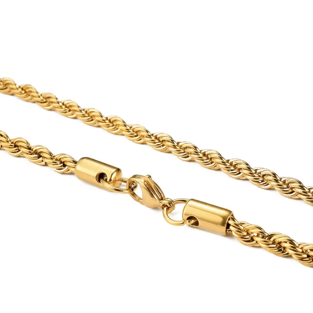 The twisted rope design is a symbol of classic fashion, making it ideal for any occasion — from casual streetwear to parties and formal events. The mirror-polished gold finish captures the light beautifully, giving off a rich and luxurious glow that enhances your outfit instantly. Whether worn alone as a statement piece or paired with a pendant, this unisex gold chain necklace is an essential addition to any jewelry collection.